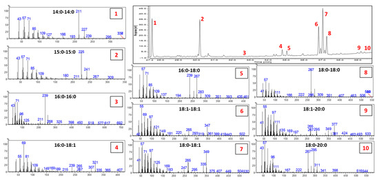 GC trace of the chemically interesterified rapeseed oil (60/40 raw and hydrogenated, respectively). The MS spectra of each of the identified peak are reported labeled with the same number of the corresponding peak and reporting the identification of the DAK.