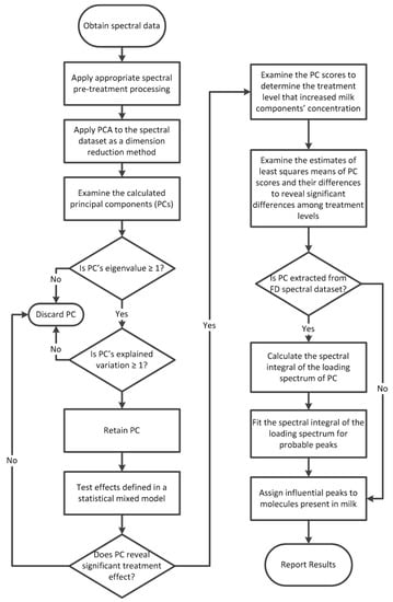 Workflow of the hybrid data analysis approach of the FTIR milk spectral data to detect a treatment effect. PCA = principal component analysis, PC = principal component, FD = first derivative.