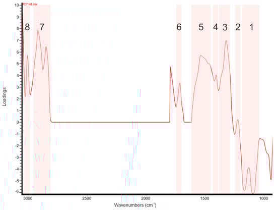 Inspection of the integral of PC7 loading spectrum (Figure 2) revealed high positive loadings at the following wavenumbers: 3008, 2919, 2851, 1716, and 1407 cm−1, which can be theoretically assigned to the following IR bands: the  stretching in the alkene (olefinic) bond () in unsaturated fatty acids, the asymmetrical stretching () of the methylene group in fatty acids, symmetrical stretching () of the methylene group in fatty acids, the  stretching vibration in the carboxyl functional group in free fatty acids and the symmetrical stretching of the carboxylate ion or the  bending in BHB, respectively []. Experimentally, these assignments can be confirmed by the results of the spiking experiment reported in Table 1. For example, the aqueous solutions of BHB and spiked milk samples with BHB revealed IR bands with increased intensity centered at 1404 and 1405 cm−1, respectively. These wavenumbers are within band 4 of the increased loadings in Figure 2.