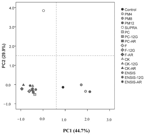 | Volatile Compounds | ID | Control | PM4 | PM8 | PM12 | SUPRA |
