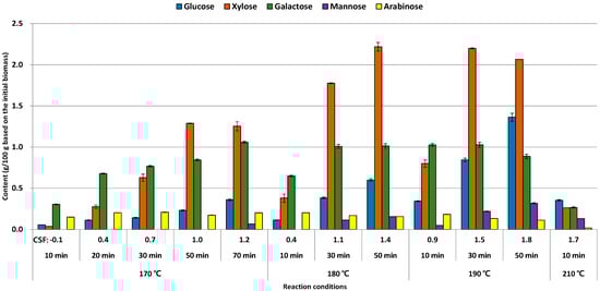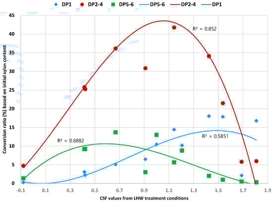 The conversion ratio of DP 2–4 showed the highest value on the ranges from 1.0 to 1.2 CSF value, and it was mostly higher than that of xylose or DP 5–6 on the trend line. The XOS of DP 2–4 has been known as high value molecules for prebiotics application among XOS because these XOS can be readily used by beneficial intestinal microorganisms []. Meanwhile, the previous studies reported that when the DP is 5 or more, the availability of microorganisms as prebiotics decreases []. Therefore, the DP 2–4 of XOS could be dominantly produced by LHW treatment in the optimal point of CSF values from 1.0 to 1.2.
