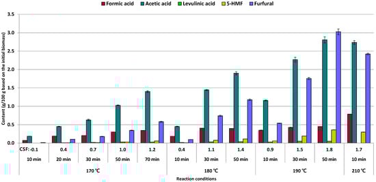 The amount of furfural was less than 1% at 170 °C of reaction temperature, but it was increased sharply up to 3.0% at 190 °C for 50 min. Furfural was converted typically from pentose through isomerization, enolization, and dehydration during acid hydrolysis []. Thus, a sufficient amount of xylose or arabinose in the liquid hydrolysate could be easily converted to furfural during the LHW treatment. In addition to a significant amount of acetic acid was released simultaneously under the severe reaction condition (190 °C for 50 min) that might accelerate furfural conversion from pentose. However, the furfural content was slightly decreased at 210 °C for 10 min because of further conversion reaction from furfural to formic acid or humin formation [].