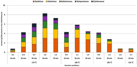 The conversion ratio of XOS (Equation (2)) from xylan in the raw material is summarized in Table 3. Generally, the total conversion ratio of XOS was increased/or decreased simultaneously by each DP of XOS, and the variation of the conversion ratio of XOS was roughly constant under all conditions. The maximum conversion ratio of XOS (67.2%) was obtained under 170 °C for 50 min condition, and the maximum conversion ratio of XOS from xylobiose to xylopentaose could be observed under this condition except for xylohexaose. In the case of 170 °C conditions, the conversion ratio of xylohexaose was the most sensitively responded to the extension of the reaction time. Consequently, high DP XOS such as xylohexaose might be difficult to survive even with a slight extension of reaction time.