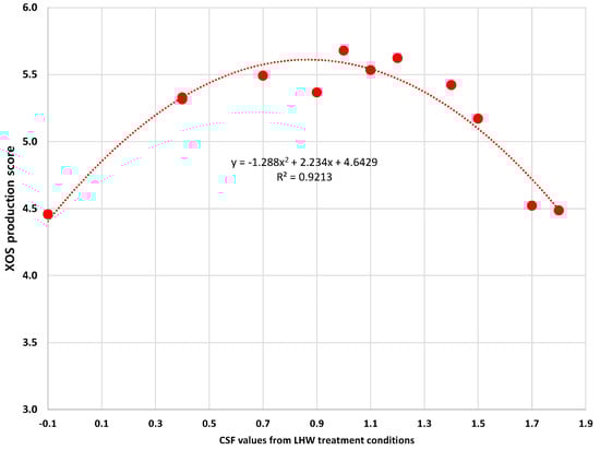 The three parameters above mentioned are very critical factors for XOS production because they are deeply related to the production cost and the quality of XOS. However, the previous three parameters alone seem to make it difficult to easily determine which LHW condition is appropriate to produce XOS. For instance, the 190 °C conditions presented high levels of low DP XOS ratios as over 91%, while the xylan extraction ratio and the XOS purity were lower than the results of 170 °C conditions. Thus, we would like to suggest the XOS production score (Equation (6)) which was established by combining the three parameters if they have an equal effect on XOS production. In this study, 170 °C for 50 min condition showed the best XOS production score (5.7). Additionally, we suggest a relationship between the XOS production score and CSF values of LHW conditions (Figure 5). Surprisingly, the relationship showed a high R-squared value (0.9213) and the trend line indicated optimum LHW conditions for XOS production. Although each of the three parameters might not have the same influence on XOS production cost, the XOS produce score could be advanced by considering additional factors such as technical-economic analysis.