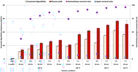 Enzymatic digestibility (%, based on a dry weight of substrate) and glucose yield (%, based on the glucose content in the initial biomass) from E. pellita and solid fractions after LHW treatment with hemicellulose and lignin removal ratio (%, based on the content in the initial biomass).