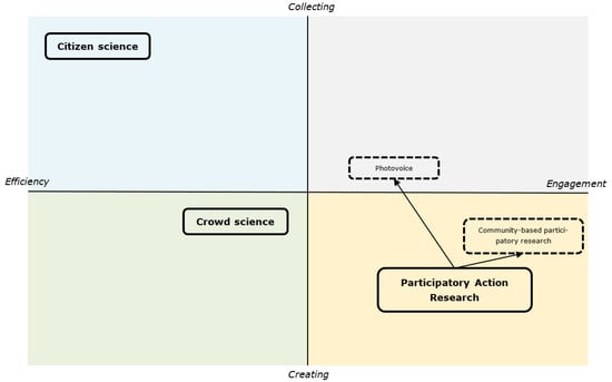 One participation method that fits in this quadrant is photovoice, which was derived from participatory action research (PAR, see Quadrant IV) and which is defined as “a process by which people can identify, represent, and enhance their community through a specific photographic technique” [10,29]. In photovoice projects, citizens take photographs of their environment, which then serve as the data for the study. Although photovoice techniques are used to ‘Engage’ a community, the role of citizens focuses more on ‘Collecting’ than ‘Creating’. This form of participatory research is thus classified in the third quadrant.