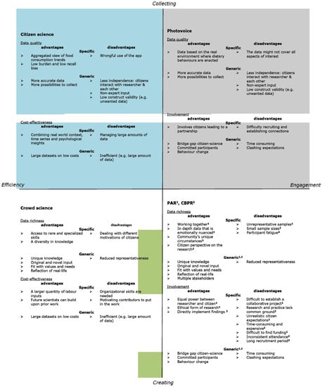 In this section, we elaborate on the advantages and disadvantages that are mentioned in food behaviour studies with regard to particular participatory methods. A full overview of the advantages and disadvantages is presented in Appendix A (Table A1). In the text, we focus on the most important advantages and disadvantages for each quadrant, based on consistencies across studies and the general literature.