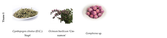 Currently, there is a growing interest in medicinal and aromatic plants (MAPs) due to the various benefits they provide to consumers’ health. MAPs, as natural sources of several bioactive compounds, have medicinal properties with great potential to be applied for the treatment of several diseases [1]. Their most common form of consumption is as tisane, or popularly known as herbal teas or infusions [2].