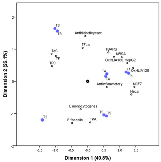 T3 sample is positively correlated with the family of compounds TF (total flavonoids), ToC (total other compounds), and TPC (total phenolic compounds), meaning that this sample present the highest concentrations, while being negatively correlated with the bacterial strains L. monocytogenes and E. faecalis (presenting the lowest MIC values, and for that manner the highest antibacterial activity against this strains). TPA (total phenolic acids) is strongly correlated with the T5 sample and is moderately correlated with T2 samples; these two samples’ negative correlation with the vast majority of the bioactive activities studied means lower IC50, GI50, and MIC values, and therefore indicates higher bioactive potential.