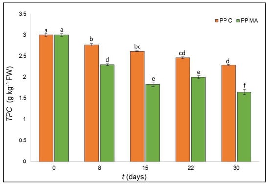 Total phenolic content of green asparagus in PP C and PP MA during 30 days of storage. Data represent the mean of three replicates ± standard deviation. Means with different letters are significantly different (p < 0.05) according to Tukey’s test.