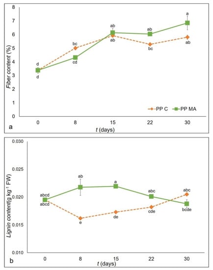 Fiber content (a) and lignin content (b) as affected by the ‘packaging material × storage time’ interaction of green asparagus during 30 days of storage in PP C and PP MA. Data are the average of three replicates ± standard deviation. Means with different letters are significantly different (p < 0.05) according to Tukey’s test.