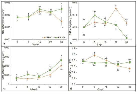 PAL activity (PAL) (a), catalase (CAT) (b), glutathione peroxidase (GPX) (c), and malondialdehyde (MDA) (d). as affected by the ‘packaging material × storage time’ interaction of green asparagus during 30 days of storage in PP C and PP MA. Data are the average of three replicates ± standard deviation. Means with different letters are significantly different (p < 0.05) according to Tukey’s test.