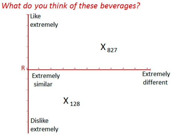 T-Map Scale used for RPM. X128 represents a mark (X) placed on the map by an assessor to show the position of product 128 on the T-Map Scale. This means that product 128 is perceived as liked less compared to the reference (R) and quite similar to the reference. Product 827 is perceived as liked more compared to the reference (R) and more different from the reference (R).