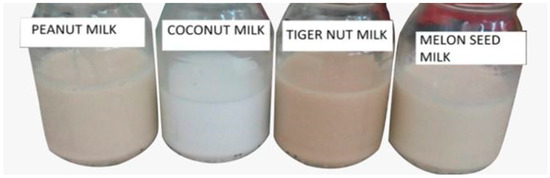 Melon seeds (Citrullus lanatus L.), peanuts (Arachis hypogea L.), coconuts (Cocos nucifera L.) and tiger nuts (Cyperus esculentus L.) were purchased from local markets in Ghana. Xanthan gum (Micrite Group Gh Ltd, Accra, Ghana) buffers: KH2PO4 and K2HPO4 (SureChem Prototypes Ltd., Suffolk, UK) were obtained in Accra while Bromelain tablets (Source Naturals, Scotts Valley, CA, USA) were obtained from the United States of America. Even ultra-high temperature pasteurized (UHT) full cream milk, a commercial pasteurized dairy milk was purchased and sweetened to a specified level and used as the reference sample for the RPM consumer test. Vitamilk, a commercial soymilk beverage (a popular plant-based dairy milk alternative) was also purchased and included in the product test set.