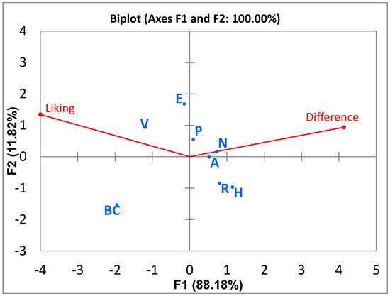 Product Map showing the area of innovation between the difference and liking axes. Legend: H—37.5% melon seed milk, 25% coconut milk, 37.5% peanut milk; A—25% melon seed milk, 50% coconut milk, 25% tiger nuts milk; P—50% coconut milk, 25% tiger nuts milk, 25% peanut milk; N—25% melon seed milk, 50% coconut milk, 25% peanut milk; R—37.5% melon seed milk, 25% coconut milk, 37.5% tiger nuts milk; E—25% coconut milk, 37.5% tiger nuts milk, 37.5% peanut milk; V*—Commercial plant-based dairy alternative and BC*— Even ultra-high temperature pasteurized (UHT) full cream milk; *—Commercial products.