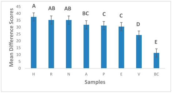 Mean difference from reference scores. Error bars are standard errors of the mean. Letters represent Fishers Fisher’s Least Significant Difference (LSD) Post hoc analysis of the means. Samples with no letters in common are statistically different at the 95% confidence level. Legend: H—37.5% melon seed milk, 25% coconut milk, 37.5% peanut milk; A—25% melon seed milk, 50% coconut milk, 25% tiger nuts milk; P—50% coconut milk, 25% tiger nuts milk, 25% peanut milk; N—25% melon seed milk, 50% coconut milk, 25% peanut milk; R—37.5% melon seed milk, 25% coconut milk, 37.5% tiger nuts milk; E—25% coconut milk, 37.5% tiger nuts milk, 37.5% peanut milk; V*—Commercial plant-based dairy alternative and BC*— Even ultra-high temperature pasteurized (UHT) full cream milk; *—Commercial products.
