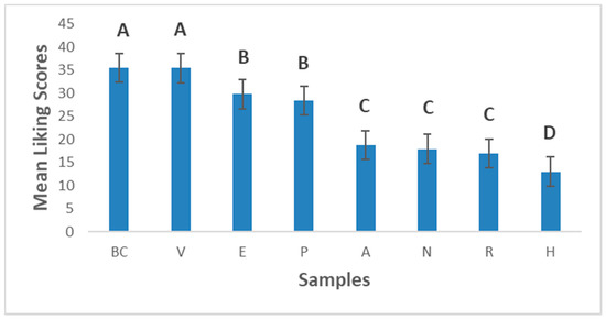 Mean liking compared to the reference. Error bars are standard errors of the mean. Letters represent Fishers Fisher’s Least Significant Difference (LSD) Post hoc analysis of the means. Samples with no letters in common are statistically different at the 95% confidence level. Legend: H—37.5% melon seed milk, 25% coconut milk, 37.5% peanut milk; A—25% melon seed milk, 50% coconut milk, 25% tiger nuts milk; P—50% coconut milk, 25% tiger nuts milk, 25% peanut milk; N—25% melon seed milk, 50% coconut milk, 25% peanut milk; R—37.5% melon seed milk, 25% coconut milk, 37.5% tiger nuts milk; E—25% coconut milk, 37.5% tiger nuts milk, 37.5% peanut milk; V*—Commercial plant-based dairy alternative and BC*— Even ultra-high temperature pasteurized (UHT) full cream milk; *—Commercial products.