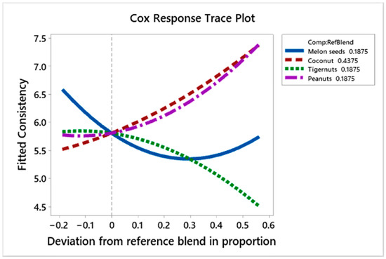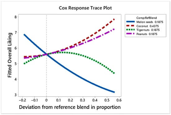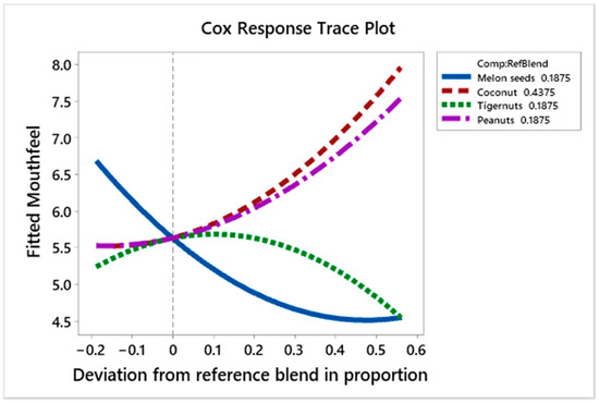 Figure 7 shows the Cox response trace plot for overall liking. As the quantity of coconut and peanut milk is increased in the formulation, the overall liking scores rise; on the other hand, tiger nut milk increases the overall liking scores as its proportion increases up to a point (+0.30 deviation from the reference blend) and then decreases liking scores as its proportion continues to increase. Melon seed milk, however, leads to a reduction in the overall liking scores of the product as its proportion increases in the formulation.
