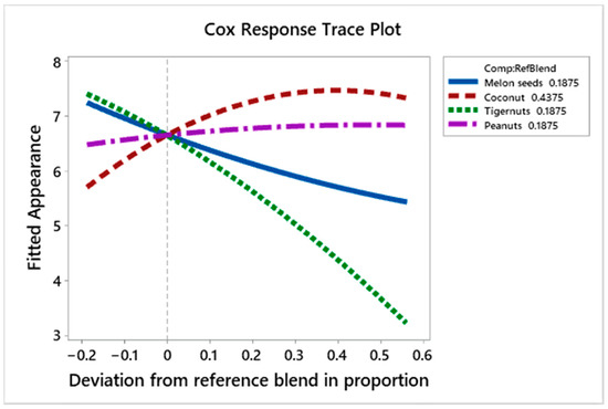Figure 8 shows the Cox response trace plot for appearance liking. Melon seed and tiger nut milk cause a decline in liking scores as their proportion increases. Tiger nut milk lowers the liking scores more; this could be due to its darker color compared to the other plant−based dairy alternatives (Figure 2). Coconut milk increases liking scores up to a point (+0.40 deviation from the reference blend), then reduces them as its amount increases; coconut milk had an extremely white color (Figure 2) that did not look like the natural color of milk, which had the potential to make the prototypes too light in color if the proportion deviates by about +0.40 from the reference blend.