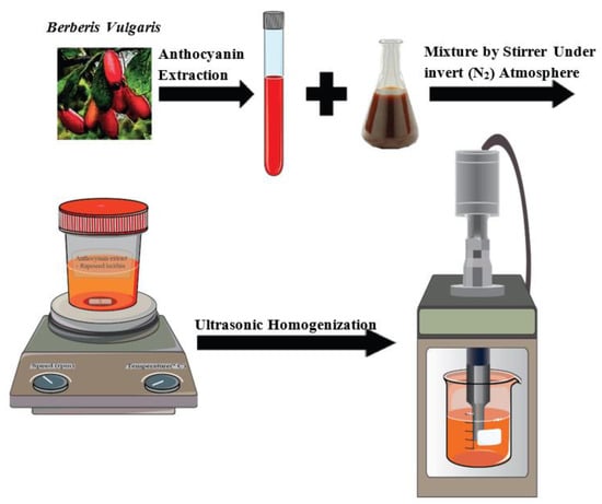 In order to prepare the nanoliposome samples, concentrated barberry AC extract was mixed with deionized water at different ratios (4.5, 6.75, and 9% w/v). After adjusting the pH, rapeseed lecithin was added to the solution by 3 w/v%. Then, the prepared mixture was stirred for 5 h under inert atmospheric conditions (nitrogen). In the next stage, in order to obtain the colloidal suspension of nanoliposomes, the samples were sonicated using an ultrasound homogenizer (probe with a diameter of 13 mm for samples with the volume of 50 mL) at the frequency of 40 kHz and power of 40% for 4 min (1 s on, 1 s off). The unloaded nanoliposomes were prepared exactly using the mentioned stages but without AC extract [9]. Schematic illustration of ACs incorporated in rapeseed nanoliposome is represented in Figure 1.