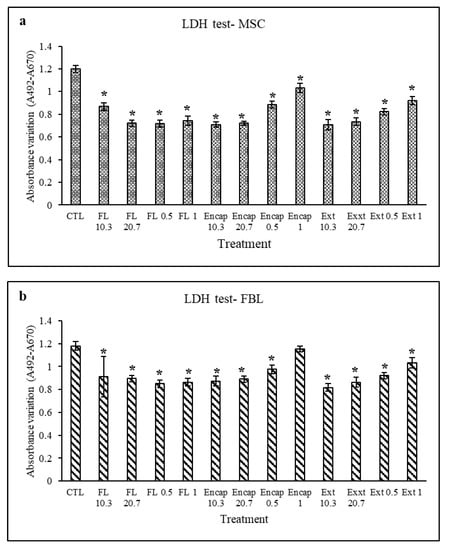 Lactate dehydrogenase activity of human cells: (a)—mesenchymal (MSC) cells, (b)—FBL cells under different treatments by: AC extract (Ext), unloaded nanoliposomes (FL) and AC-loaded nanoliposomes (Encap). CTL is control sample including unstimulated cells. Indexes of 1, 0.5, 20.7 and 10.3 represent the concentration of different treatments as 1 mg.mL−1, 0.5 mg.mL−1, 20.7 µg.mL−1, and 10.4 µg.mL−1 respectively. * indicates there is significant statistical difference between different treatments and control sample (p < 0.05). the results are mean of three replications ± SD.