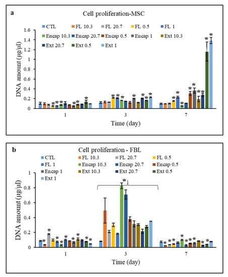 The results of the effect of different treatments on the proliferation of FBL and MSC cells are demonstrated in Figure 5. As observed in Figure 5a, in all of the samples containing MSC cells, the DNA content increased over time, except for FL-10.3, FL-20.7, FL-0.5, Encap-10.3, and Encap-20.7, which had a descending trend on the seventh day.