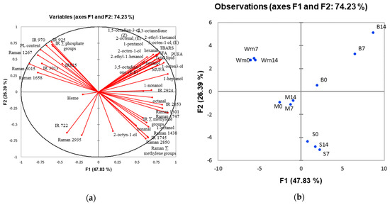 Correlation loading plot (a) and score plot (b) of principal component analysis describing measured quality parameters, namely volatile compounds, fatty acid profiles, lipid oxidation indicators and band intensity obtained from FT-IR and FT-Raman spectroscopy of skin (S), belly flap (B), and mince (M) of silver carp stored in ice for various times 0, 7 and 14 days and washed mince (Wm) prepared from fish stored in ice for 0, 7, and 14 days.