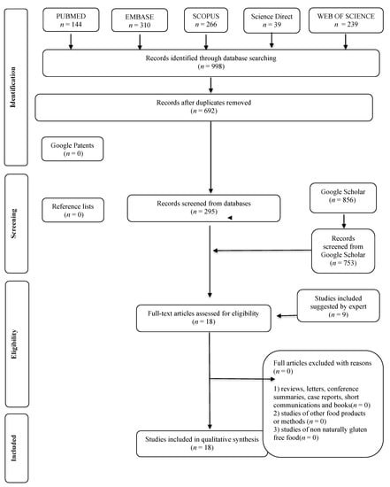 In November 2020, we performed a systematic review to evaluate and compare the characteristics of GFBs’ GI and its main ingredients. The increasing demand for gluten-free products, primarily GF bread with a good nutritional profile and sensory quality, justify the importance and the need to evaluate the glycemic index of gluten-free bread and the main ingredients used in their formulations. For scientific rigor, this systematic review was reported according to the Preferred Reporting Items for Systematic Reviews and Meta-Analyses (PRISMA) Checklist [16], as described in the Supplementary File S1 and Guidance of the European Food Safety Authority [17]. The PICOS criteria used to define the research questions were: Participants: Human subjects or in vitro human digestion simulation; Intervention: Glycemic index gauging; Comparison: Glycemic index of glucose or white bread; Outcome measure: Glycemic impact; Type of studies included: Scientific manuscripts and patents (Supplementary File S1).