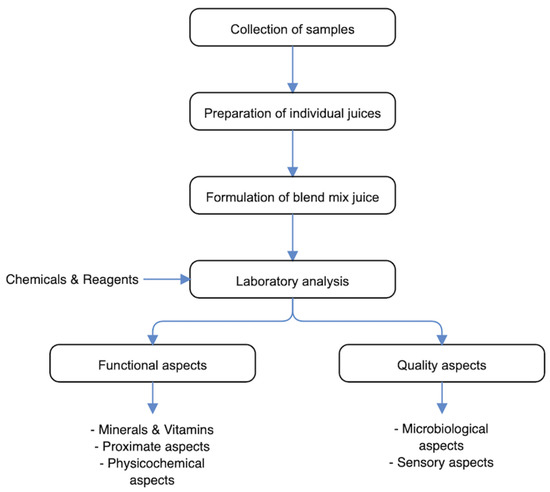 The schematic overview of the experimental program, depicting the essential stages from the collection of ginger, pineapple and turmeric, and preparation of individual juices, to the formulation to make the mix juice, and then, the functional and quality aspects of the laboratory analyses.