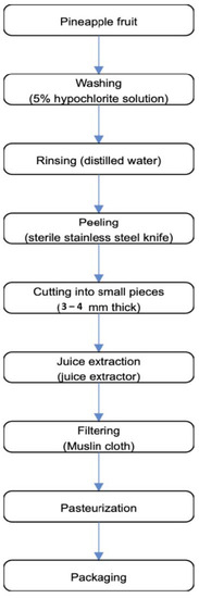 The preparation of pineapple fruit juice followed the method of Okwori et al. [28] with slight modifications, depicted in Figure 2. Pineapple fruits were selected and washed with 5% HOCl solution and thoroughly rinsed with distilled water before peeling with a sterilized knife. The fruits are cut into sizes of about 3–4 mm thick and juice extraction using a juice extractor. The pineapple juice was filtered using sterile muslin cloth, which was folded into two layers and filtered into a clean transparent bowl. The juice was filled into an air-tight screwed cap, pasteurized, and refrigerated at ~4 °C prior to analysis.