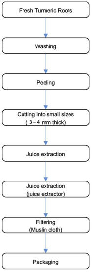 Following the method prescribed by the Top 10 Home Remedies Team [29], herein depicted in Figure 3, five fresh turmeric rhizomes were rinsed under clean running tap water to remove the dirts. The turmeric rhizomes were peeled and then cut into pieces and put into the blender, and at the same time, supplemented little equivalents of clean/filtered water were added to ease friction during blending. The juice pulp was then filtered using a sterile muslin cloth to get the juice, which was subsequently refrigerated at ~4 °C, until required.
