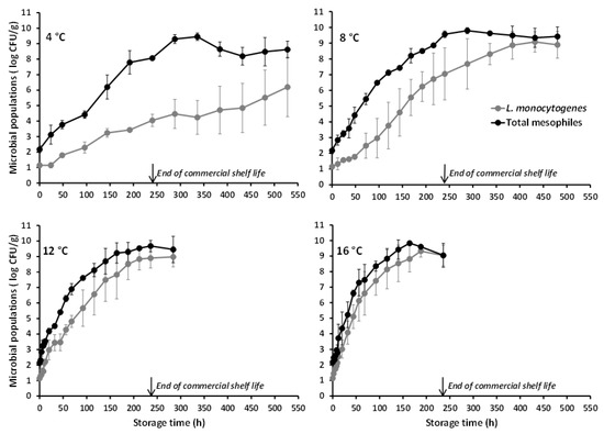 The L. monocytogenes populations in battered chicken nuggets (as enumerated on PALCAM agar) under the different tested isothermal conditions are shown in Figure 1. The mean (±standard deviation (sd), n = 4) inoculation level (i.e., time-zero concentration) of the organism attained in the product was 1.15 (±0.17) log CFU/g. As demonstrated both graphically and by the estimated growth kinetic parameters (Table 1), the pathogen’s growth behavior in battered chicken nuggets was, as expected, temperature-dependent with increasing storage temperature resulting in faster growth. Indeed, the mean (±sd, n = 4) L. monocytogenes population (log CFU/g) recorded at 240 h of storage (corresponding to the end of the product’s commercial shelf life) was 4.04 (±0.40), 7.05 (±1.65), 8.90 (±0.64), and 9.04 (±0.67) at 4, 8, 12, and 16 °C, respectively (Figure 1). The significant effect of temperature on μmax was also demonstrated by the results of one-way analysis of variance, according to which the estimated value of the test statistic was F (3,12) = 12.49 (p = 0.001).