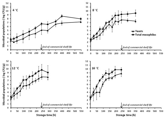 With reference to the naturally occurring microbiota of the studied poultry product, this appeared to be comprised predominantly by psychrotrophic yeasts. In the artificially inoculated chicken nuggets, the TSA microbial counts were higher than the PALCAM agar counts, with the recorded difference being reduced as storage temperature increased (Figure 1). Furthermore, the TSA counts obtained at all storage temperatures were similar to the microbial counts determined on RBC agar with the latter corresponding solely to colonies with typical yeast-like appearance (i.e., no mycelial growth was noted). Actually, the yeasts’ growth during storage of the chicken nuggets at refrigeration (4 °C) and slightly abusive temperatures (8 °C), as recorded in the present study (and reflected in the total mesophilic microbial populations), was markedly superior to the observed L. monocytogenes growth (Figure 1). The predominance, if not exclusive presence, of yeasts in the natural microbiota of the studied chicken nuggets, is also demonstrated by the microbiological analyses’ results of the uninoculated (control) product samples (Figure 2). The yeasts and total mesophiles exhibited similar growth profiles and population levels during storage at all tested temperatures, while the slightly higher microbial counts obtained on TSA (as compared to those on RBC) are, most likely, attributed to the absence of selective agents (potentially acting as stress factors) in this generic medium. The use of RBC agar (over other selective growth media) for the characterization of the chicken nuggets’ natural microbiota was based on the findings of preliminary experiments according to which, yeasts proliferated during storage and constituted the dominant naturally occurring microbial group throughout the product’s shelf life. No detectable populations of naturally occurring Listeria spp. were enumerated during storage of the control chicken nuggets throughout storage at none of the tested isothermal conditions, while bacteria belonging to the Enterobacteriaceae family, including specifically Salmonella spp., were also below the detection limit (<1 log CFU/g) at all temperatures and sampling intervals. Since psychrophilic bacterial populations were not enumerated in the framework of the present work, future studies, specifically designed and conducted for this purpose, should contribute to the in-depth characterization of the microbial association of this product and its evolution during storage.