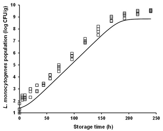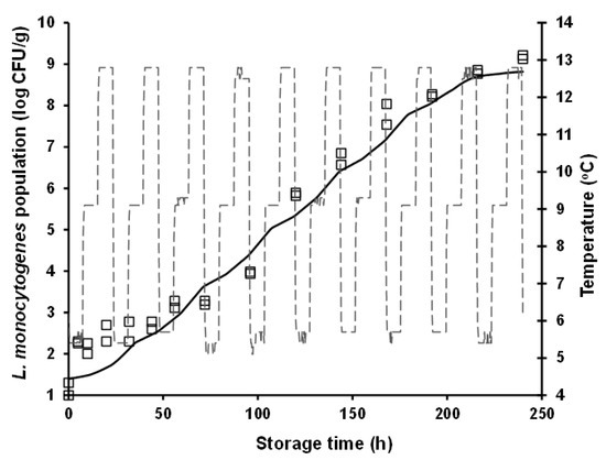 In both model validation cases (isothermal and dynamic temperature conditions), it can be noted that the fail-dangerous predictions are essentially related to the initial storage period of chicken nuggets, approximately up to 30 h (Figure 3 and Figure 4). This is particularly evident in the case of the isothermal prediction where, as graphically illustrated in Figure 3, the linear part of the predicted growth curve is parallel (i.e., similar slope) to the one of the actually observed growth. The relative incompetence of the developed models to provide accurate predictions at low L. monocytogenes population levels (ca. up to 2.5 log CFU/g) may be associated with the low inoculation level utilized in this study and the variability and uncertainty associated with it, as discussed above. Still, and despite the limitations, it is very important that realistically low inoculation levels of foodborne pathogenic bacteria are considered in quantitative microbiology studies. To this end, the present study is among the very few ones providing growth characterization based on low initial cell concentrations. Yet, future research should address challenges encountered when low cell concentrations are studied, through model optimization and fine-tuning attempts based on: (i) better characterization of the biological variability in growth kinetic parameters, particularly in the lag phase of the growth curve, and integration of this variability via stochastic modelling approaches; and (ii) reduction of the uncertainty associated with the applied experimental procedures through the conductance of multiple experimental replicates and the acquisition of larger initial microbial concentration datasets. Moreover, it should be acknowledged that although allowing for the integration of potential growth variation among L. monocytogenes strains, the multiple-strain composite utilized in the present study results in model predictions that cannot be linked to specific strain(s) of the organism. Molecular monitoring of the evolution of L. monocytogenes strains comprising the applied inoculum in food safety challenge studies has demonstrated that the pathogen’s strains dominating during storage may be considerably affected by the environmental conditions (e.g., temperature), highlighting the importance of strain selection in quantitative microbiology studies [45].