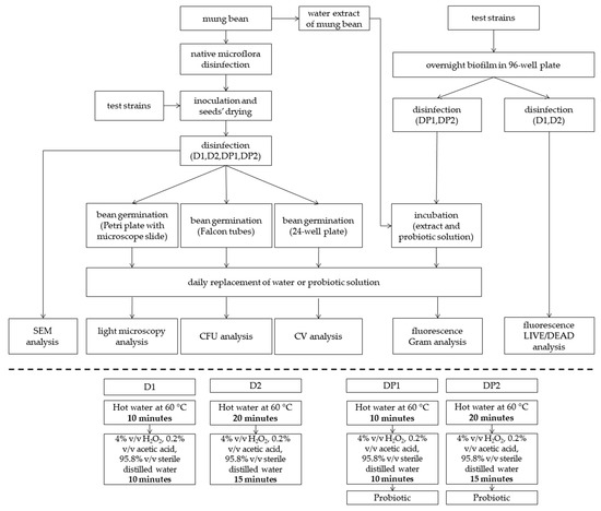 Disinfecting treatments were carried out using two methods developed by Trząskowska et al. [31]. The mung bean seeds in the first method (D1) were treated for 10 min with sterile distilled hot water at 60 °C. After this time, the water was decanted and the seeds were poured over with the disinfecting mixture for another 10 min. In the second method (D2), the material was treated for 20 min with sterile distilled hot water at 60 °C. After this time, water was poured in and the seeds were poured over with the disinfecting mixture for 15 min. The disinfecting mixture consisted of 4% v/v H2O2 (30% v/v in H2O, Chempur, Piekary Śląskie, Poland), 0.2% v/v acetic acid (99.5% v/v in H2O, Chempur, Piekary Śląskie, Poland), and 95.8% v/v sterile distilled water. All components were mixed just before adding to the disinfected material. After sanitation, the mixture was poured and the material was washed 3 times with sterile distilled water to remove excess hydrogen peroxide from the surface. Test strips were used to detect residual hydrogen peroxide (Quantofix, Sigma-Aldrich Co., Poznań, Poland). At each described step, the material to liquid ratio was 1:2. There were 5 different seed variants for each strain: C (not disinfected with any method), D1 (disinfected with the first method), D2 (disinfected with the second method), DP1 (disinfected with the first method + L. plantarum 299v), DP2 (disinfected with the second method + L. plantarum 299v). The probiotic was added in the form of a cell suspension in 0.85% sterile saline; the number of cells was approximately 7 log/mL.