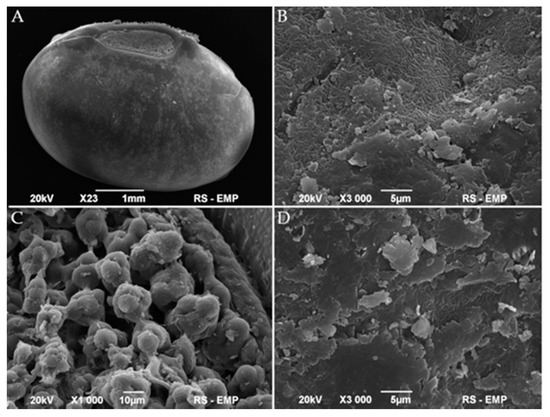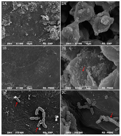 To some extent, the above results are supported by the scanning electron microscopy (SEM) images of the disinfected mung bean surface. The whole seed, hilum, and coat of air-dried mung bean examined by SEM are presented in Figure 2 and Figure 3. The micrographs of native mung bean show the openings in the hilum and the cracks on the coat. However, we do not observe any significant presence of microorganisms (Figure 2). After inoculation, pathogens colonized the surface of the cover and adhered to the hilum structures (Figure 3(1A,2A)). The applied, multi-stage disinfection method (D2 and DP2) limited the number of visible microorganisms and negatively influenced the cell structure (Figure 3(1B,1C,2B,2C)). The addition of the next stage of disinfection, i.e., the biological agent (L. plantarum 299v), resulted in the colonization of the surface of sanitized beans by this bacterium as cells in very good condition (Figure 3(1C,2C)). Unfortunately, the uneven surface makes it possible for individual cells to survive and develop during germination.