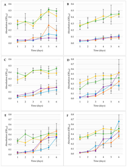 Formation of biofilms by E. coli ATCC 10536 (A); E. coli O157:H7 (B); E.coli ATCC 25922 (C); S. enteritadis ATCC 13076 (D); S. enteritadis ATCC 29631 (E); S. hofit IFM 2318 (F) on the surface of 24-well microplate for 6 days at 22 °C. C—control, not disinfected with any method; D1—disinfected with the 1st method; D2—disinfected with the 2nd method; DP1—disinfected with the 1st method + L. plantarum 299v; DP2—disinfected with the 2nd method + L. plantarum 299v; C —●; D1—●; D2—●; DP1—●; DP2—●; n = 4.