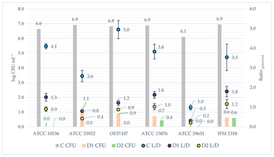 The survival of tested strains after disinfection procedure measured by fluorescence staining vs. CFU analysis. Explanations: L/D—LIVE/DEAD method = fluorescence staining; CFU—colony forming units method; bars refer to CFU results; dots refer to fluorescence staining analysis; C—control, not disinfected with any method; D1—disinfected with the 1st method; D2—disinfected with the 2nd method; DP1—disinfected with the 1st method + L. plantarum 299v; DP2—disinfected with the 2nd method + L. plantarum 299v.
