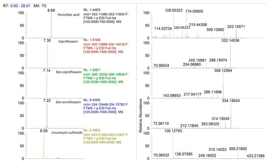 Each positive sample was reprocessed in full scan data dependent mode (FS-dd-MS2) and the raw files obtained were submitted to Compound Discoverer (CD) 3.1 software (Thermo Fisher, Waltham, MA, USA), which enabled programmed identification of antibiotic metabolites. The resolving power of FS was adjusted on 70,000 FWHM at m/z 200, with the scan range of m/z 125–1000. Automatic gain control (AGC) was set at 3 × 106, with an injection time of 200 ms. A targeted dd-MS2 analysis operated at 35,000 FWHM (m/z 200). The AGC target was programmed at 2 × 105, and the maximum injection time was set at 100 ms. Fragmentation of precursors was optimized as three-stepped normalized collision energy (NCE) (20, 40 and 40 eV).
