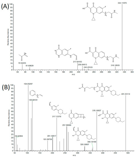 Enrofloxacin, according to the literature [12,21], is extensively metabolized into ciprofloxacin and other minor metabolites, with the former still retaining antimicrobial activity. Two new metabolites that had not been reported in the literature were tentatively identified (Table 3, Figure 2).