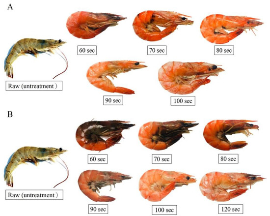 Appearance changes in white shrimp using microwave-assisted induction heating (MAIH) system set at 130 °C (A) and 90 °C (B) for different heating times.