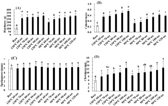 Changes in texture properties of hardness (A), cohesiveness (B), springiness (C), and chewiness (D), in peeled white shrimp using microwave-assisted induction heating (MAIH) system set at 130 and 90 °C for different heating times. Each value is the mean ± standard deviation (n = 4); the different letters by the bars indicate significant differences (p < 0.05).