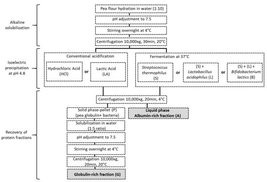 The extraction route was indicated in Figure 1. Pea proteins were extracted by AEIEP method, which first comprised an alkaline solubilization of protein and subsequent removal of the insoluble material from pea flour by centrifugation. Hence, pea flour was mixed with water (weight ratio of 1:10), and the pH of the solution was adjusted to 7.5 with NaOH (0.5 M). The solution was then stirred overnight at 4 °C, and pH was readjusted to 7.5. Insoluble material was removed by centrifugation (10,000× g, 30 min, 20 °C), and the supernatant was collected. Acid precipitation was used to separate pea globulin-rich and albumin-rich fractions. The acidification was achieved by fermentation with S, SL or SLB starters. The selected strains of bacteria were added into the protein suspensions at usual recommended concentrations indicated by DCU values. The values, in 1.4 L of protein suspension, were 0.119, 0.3 and 0.3 g of S, SL and SLB, respectively. The samples were then placed into an incubator (Sanyo incubator MIR-153 w, Osaka, Japan) at 37 °C under moderate stirring (each fermentation was prepared in triplicate). The pH of the incubated pea protein was measured continuously and automatically recorded at 5-min intervals (Portavo 907 Multi pH, Knick, Berlin, Germany). The acidification was stopped at pH 4.8, and the fermentation time was used as a descriptor to calculate the acidification activity of each starter. After acidification with S, SL or SLB, the obtained suspensions were centrifuged (10,000× g, 30 min, 4 °C). Pellet samples (P) (PS, PSL, PSLB), containing mainly globulins and biomass, and supernatants (A) (AS, ASL, ASLB), containing mainly albumins, were obtained, respectively. In order to obtain the corresponding globulin-rich fractions (G) (GS, GSL, GSLB), respective pellet samples were solubilized in water (1:5 ratio), and the pH was adjusted to 7.5 with NaOH 0.5 M. The samples were kept under stirring overnight at 4 °C, and the pH was readjusted to 7.5. The solution was then centrifuged (10,000× g, 20 min, 20 °C), and the supernatant collected. The samples were stored in a freezer at −18 °C until utilization. Only one part of each albumin fraction was freeze-dried (Heto PowerDry PL6000, Thermo Scientific, Waltham, MA, USA) to prepare samples for differential scanning calorimetry analysis and nitrogen content. The freeze-drying condition were the same as the indicated by Oliete et al. [40]. As controls, pea protein fractions were obtained with conventional acid precipitation by using hydrochloric acid (HCl) 0.5 M or lactic acid (LA) 0.5 M following the same other steps. The different fractions, including pellets (PHCl, PLA), globulins (GHCl, GLA) and albumins (AHCl, ALA), were then compared with the fractions obtained by fermentation.