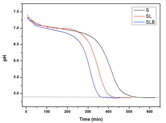 Figure 2 shows the typical acidification kinetics of the cultures used (S, SL, SLB). Pea protein extract was a good substrate for the strains, as they were all able to reduce the pH up to 4.8. As pea seeds contain a part of fermentable sugars (𝛼-galactosides and sucrose) [45], it is likely that these sugars were also solubilized in the extracted protein suspension in a non-limiting amount for bacteria growth. It is well known that many LAB strains possess enzymes to metabolize these sugars into lactic acid [46]. Otherwise, the time required to reach the target pH was shorter for the mixed cultures. S showed the largest lag phase compared to the mixed cultures. It changed from lag phase to log phase in 5 h and then reached the stationary phase after 4 h. SLB had the highest growth rate in pea protein substrate. It took about 3 h for it to reach log phase and 2.5 h to reach the plateau. SL showed the same behavior as SLB, although it reached the stationary phase after approximately 3 h growth. Indeed, the acidification rate in lactic fermentation highly depends on the strains and the bacteria mixture [26,47]. For instance, fermentation of soymilk with different strains of Lactobacillus acidophilus and Bifidobacterium lactis revealed a sharp difference in the rate of acid production [48,49]. Furthermore, the synergistic effect of combined bacteria strains could cause an accelerated and efficient organic acid production during fermentation process itself, as already indicated [19]. The importance of such synergy on acidification activity of lactic acid bacteria has been studied extensively. Wang et al. [50] showed that lower pH and higher titrable acidity were obtained with mixed culture of Streptococcus and Bifidobacterium lactis compared to Streptococcus thermophilus alone. This was confirmed by De Souza et al. [51], who reported that the mixed cultures of Streptococcus thermophilus and Bifidobacterium lactis had better acidification profile than their mono-cultures. Helland et al. [52] also showed that Bifidobacterium lactis had better growth in co-culture fermentation with Lactobacillus acidophilus. Moon et al. [53] also compared the developed acidity of mixed and pure cultures. The authors reported that the growth of Streptococcus thermophilus increased in mixed culture with Lactobacillus acidophilus. Garcia et al. [54] showed the incorporation of Streptococcus thermophilus with lactobacilli strains led to higher acidification and significant reduction in the pH. Besides, Streptococcus thermophilus is always the dominant species in the mixed cultures, with the greatest growth regardless of the substrate [55].