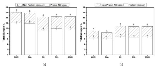 Total nitrogen (non-protein and protein nitrogen) content of (a) globulin fraction obtained by controls (GHCl, GLA) and fermentations (GS, GSL, GSLB), (b) albumin fraction obtained by controls (AHCl and ALA) and fermentations (AS, ASL, ASLB). Different capital letters represent significant differences in total nitrogen content, and small case letters represent significant differences in protein nitrogen among different samples (Tukey’s post hoc test).