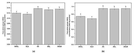 Free amino group content (mM/mg protein) of (a) globulin fractions obtained by controls (GHCl, GLA) and fermentations (GS, GSL, GSLB), (b) albumin fractions obtained by controls (AHCl, ALA) and fermentations (AS, ASL, ASLB). Different letter represents significant differences among different samples (Turkey’s post hoc test).