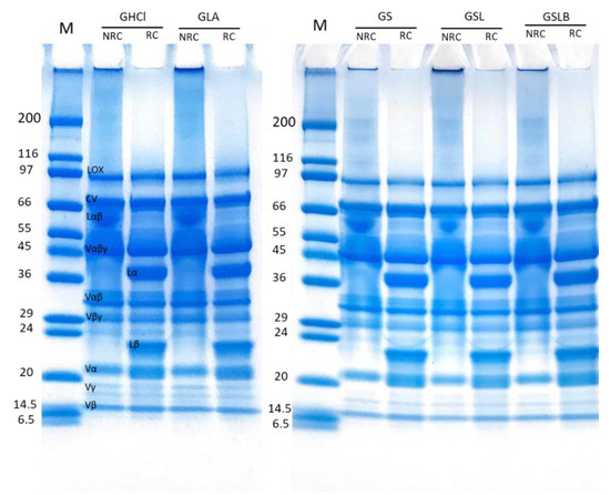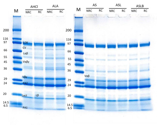 SDS-PAGE was performed in non-reducing and reducing conditions to determine the effect of extraction method on polypeptide composition of the recovered globulin (Figure 6) and albumin (Figure 7) fractions. In non-reducing conditions (NRC), the globulin-rich samples’ profiles (Figure 6) revealed the presence of bands ranging from 10 to 99 kDa, characteristic of pea proteins [62]. The majority of these polypeptide bands represented various subunits of vicilin including the monomer (Vαβγ, ~50 kDa) and the cleavage-resulting polypeptides (Vαβ, ~30–36 kDa; Vβγ, ~25–30 kDa; Vα, ~20kDa; Vβ, ~13kDa; Vγ, ~12–16 kDa) [62,63]. There is also the presence of legumin monomer (Lαβ, ~60kDa), which separated to acid (Lα, ~40 kDa) and basic (Lβ, ~21–23 kDa) subunits in reducing condition [13]. The higher-molecular-weight bands corresponded to lipoxygenase (LOX, ~94 kDa) and convicilin (CV, ~71 kDa) [64]. The results indicated no significant difference in polypeptide profile of the globulin fractions obtained by either chemical acidification or lactic fermentation. The final polypeptide composition of globulin isolate was apparently not affected by the extraction method, although a global loss of globulins was observed, as indicated before. The presence of smaller polypeptides than 6 kDa, not observable on the electrophoretic profile because they migrated beyond the limit of the gel, cannot be excluded in the case of fermented samples, since free amino group content increased, as observed above.