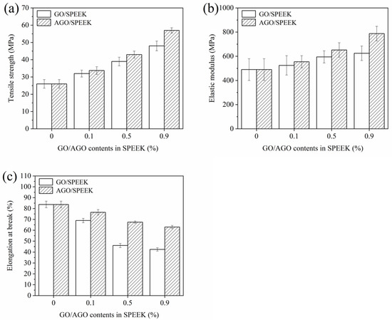 Mechanical properties of AGO/SPEEK films. (a) Tensile strength, (b) elastic modulus, (c) elongation at break.