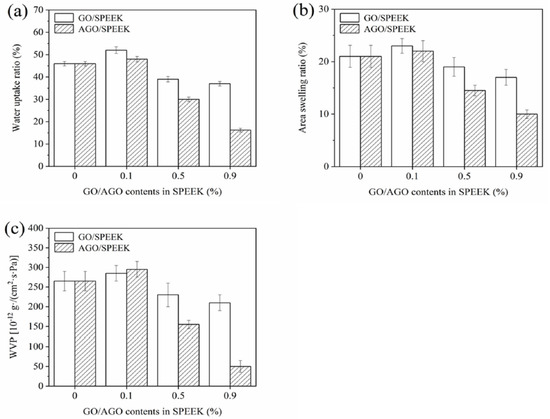 The swelling ability is an important factor in composite films and represents its water absorption resistance property and type of film use. The water absorption tendency of the film affects the swelling ability to a certain extent. Consequently, the water absorption of the film shows a trend similar to that of the swelling ability. As shown in Figure 4a,b, the swelling ability of both the films shows a trend that first increases and then decreases, and this was mainly attributed to the influence of functional groups. When the added amount of the inorganic filler (GO/AGO) was less than 0.1% (w/w), the hydrophilic functional groups in the inorganic filler resulted in temporary increase in the swelling ability of the film. However, when the amount was more than 0.1% (w/w), “blocking effect” caused by the increase of functional groups played the main role, leading to a decline in swelling [15,31]. Specifically, the area swelling ratio of films with 0.5% and 0.9% (w/w) AGO was significantly reduced, reaching 15% and 10%, respectively. Moreover, the area swelling ratio of the AGO/SPEEK film was lower than that of the GO/SPEEK film under the same loading, which was ascribed to the less hydrophilic amide groups introduced by AGO, and it narrowed the gap of the SPEEK polymer chain. Thereby, it can be concluded that the incorporation of AGO and SPEEK matrix can improve the usability of films for high-humidity food packaging.