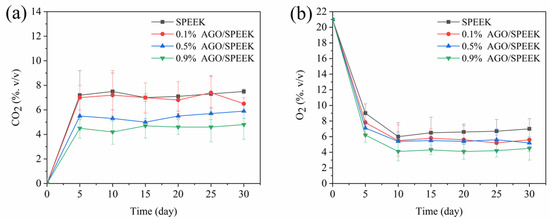 Internal atmosphere composition under AGO/SPEEK films packaging in the storage of cherry tomatoes. (a) CO2, (b) O2.